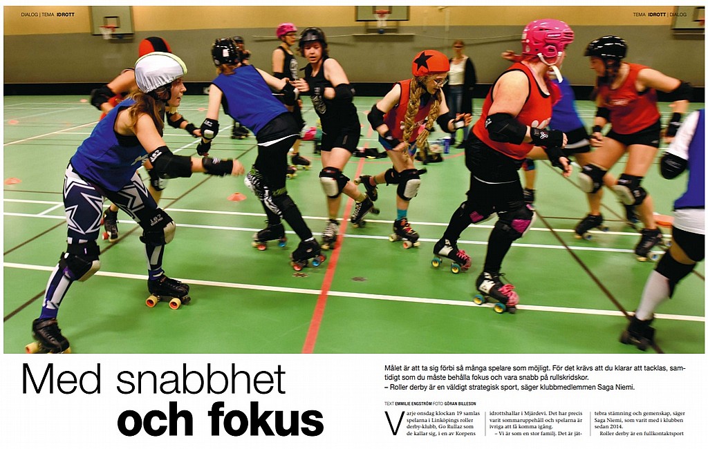 Genom ett litet fönster till idrottshallen står ett helt innebandylag och tittar in. Det är roller derby laget GoRullaz som drar till sig uppmärksamheten.